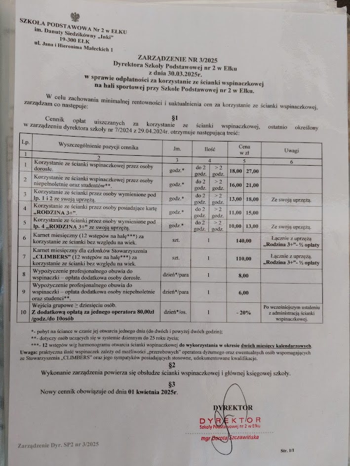 Cennik ściany wspinaczkowej